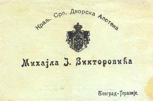 mm x 118 mm Serbisk receptkuvert med kyrylisk skrift Tekst: "Det kongelige Serbiske Hofapotek" med apotekerens navn "Michailo J. Viktorovic" Beograd |